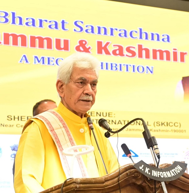 Addressing ‘Bharat Sanrachna J&K 2025’ exhibition here, LG Sinha, according to the news agency—Kashmir News Observer (KNO), emphasized the importance of innovation, self-reliance, and grassroots empowerment in building a “New India.”